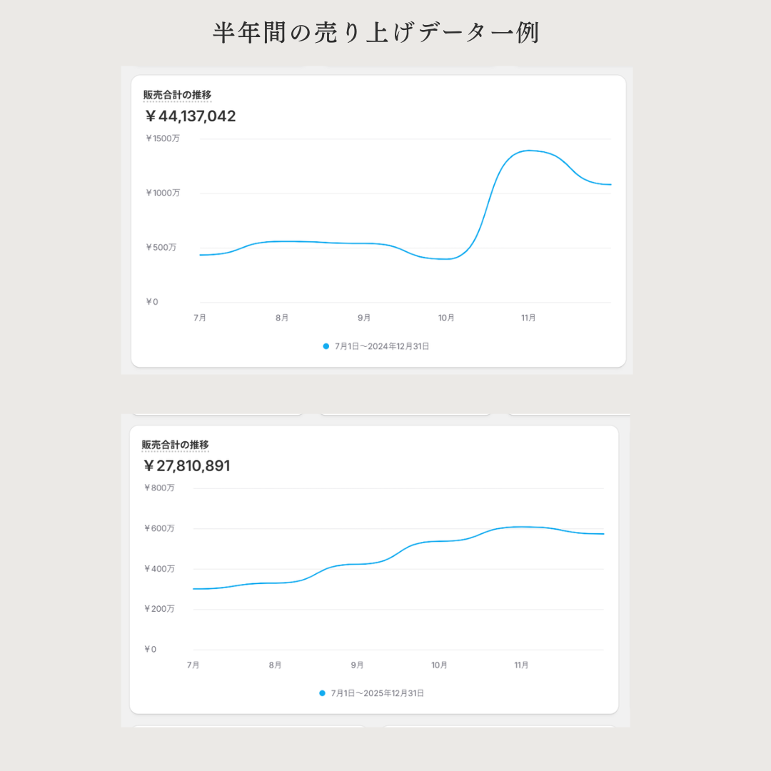 3つのブランドをゼロから立ち上げ、月商500万〜2,400万円規模まで成長させてきました。 同じコンセプトで売り続ける難しさを理解し、改善を積み重ねてきた実績があります。